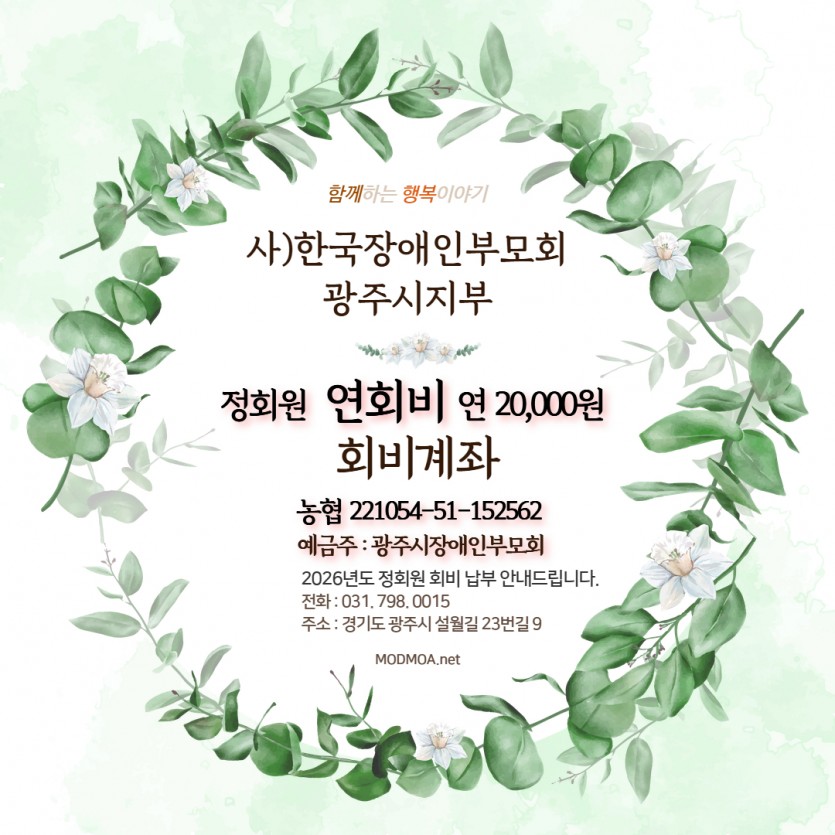 2026년 장애인부모회 정회원 회비 납부 안내 페이지 정보 작성자 부모회 댓글 0건 조회 89회 작성일 26-02-25 14:22 목록 본문 다음글사)한국장애인부모회 광주시지부 직원 채용공고 26.01.08 댓글 0 댓글목록 등록된 댓글이 없습니다.